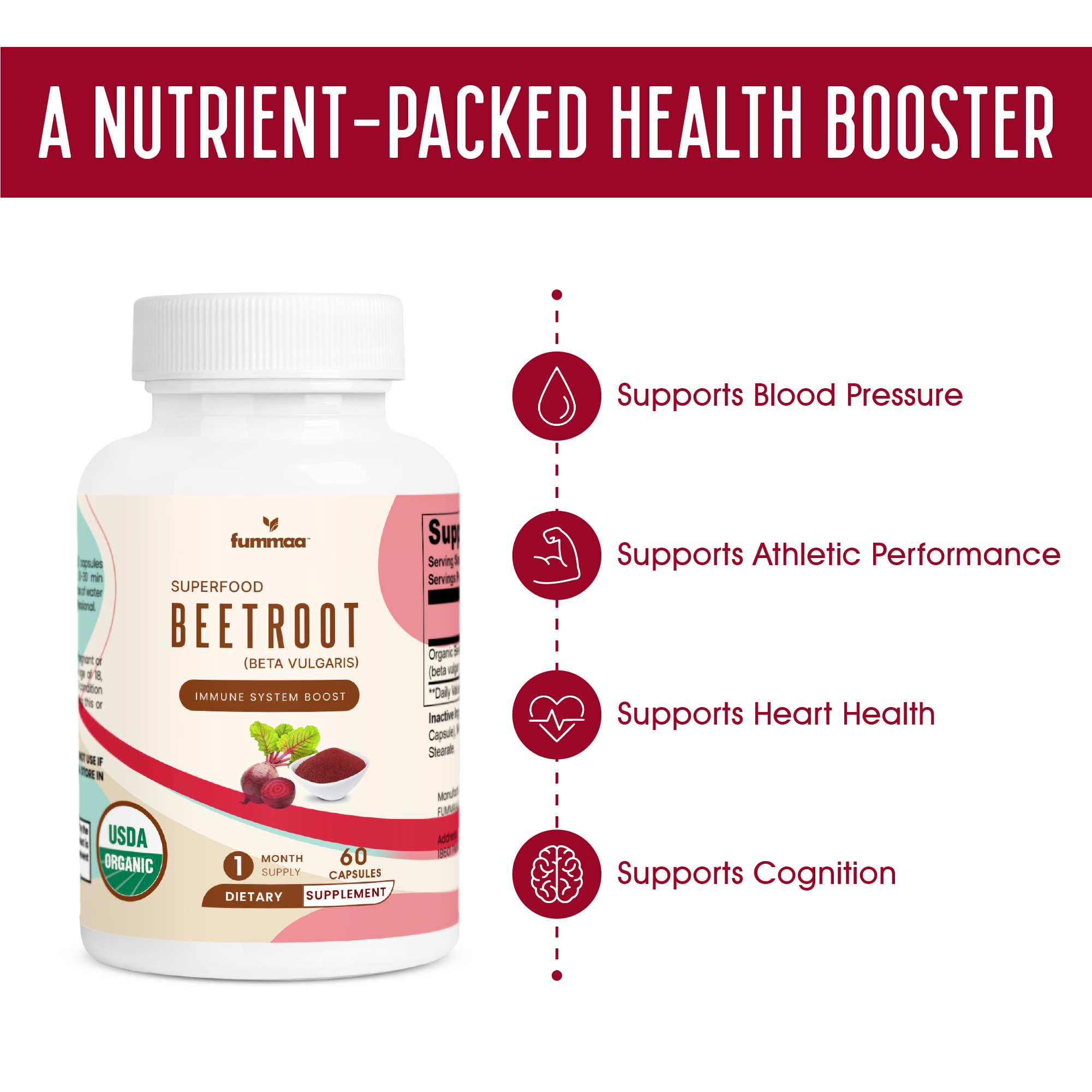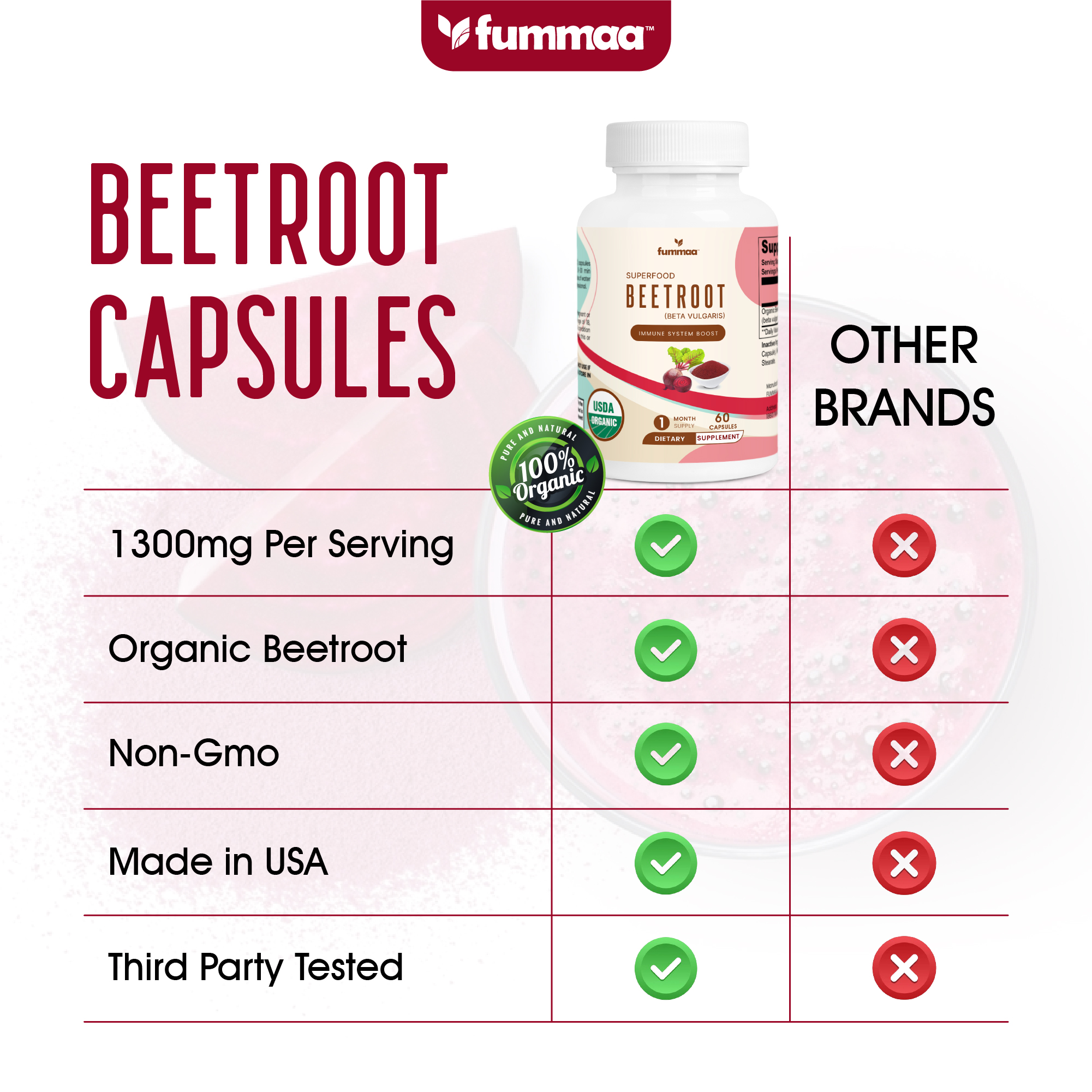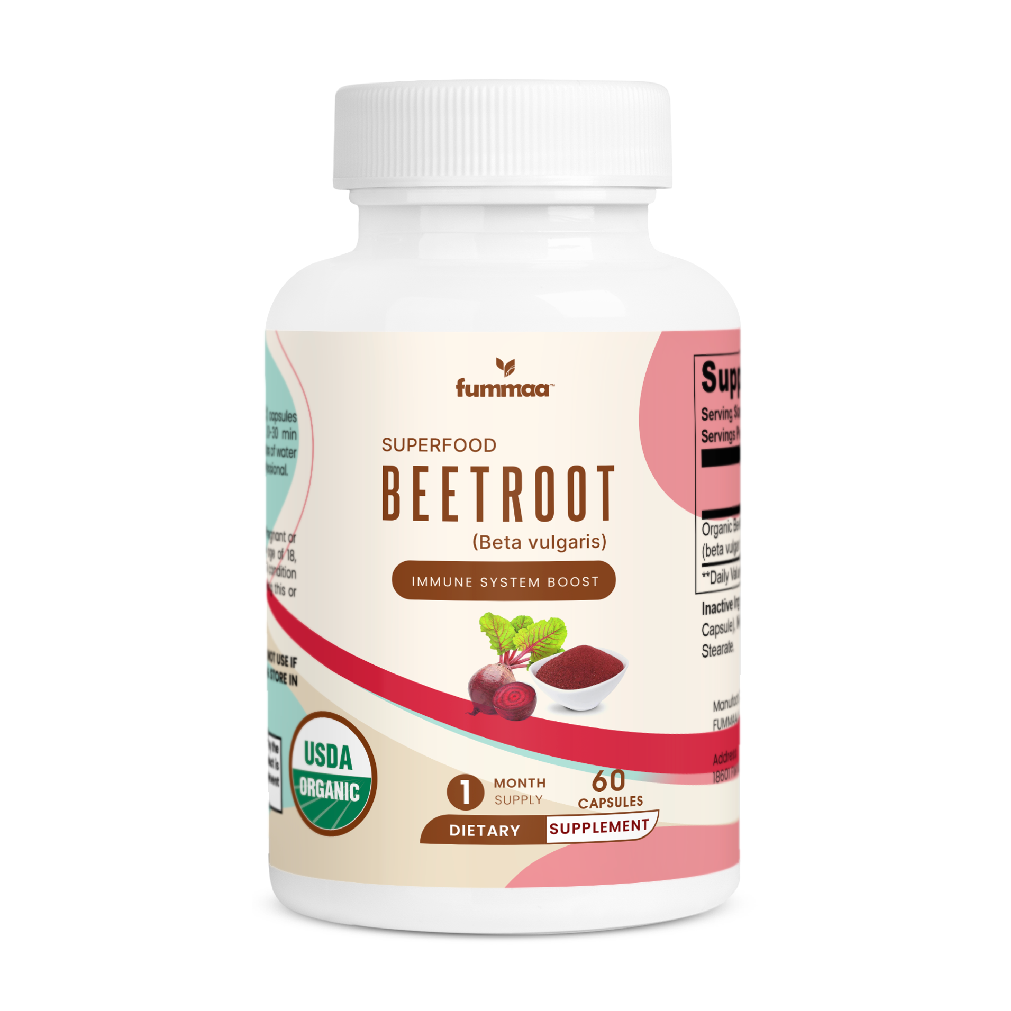 | Ingredients | Organic Beetroot Powder (beta vulgaris), Cellulose (Vegetable Capsule), Microcrystalline Cellulose, Magnesium Stearate. |