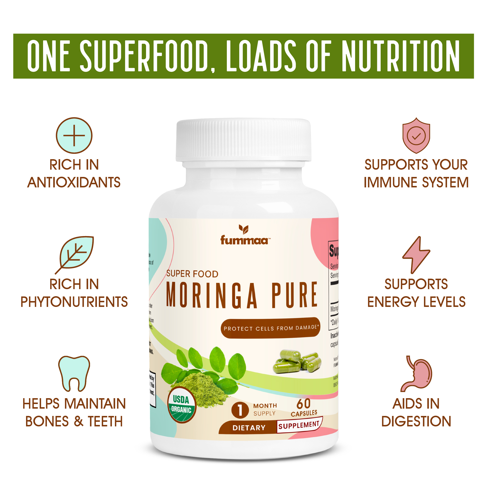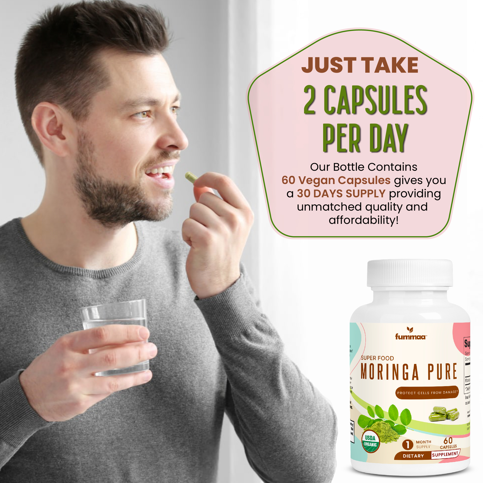 | Ingredients | Moringa Oleifera (leaf), Cellulose (vegetable capsule) |