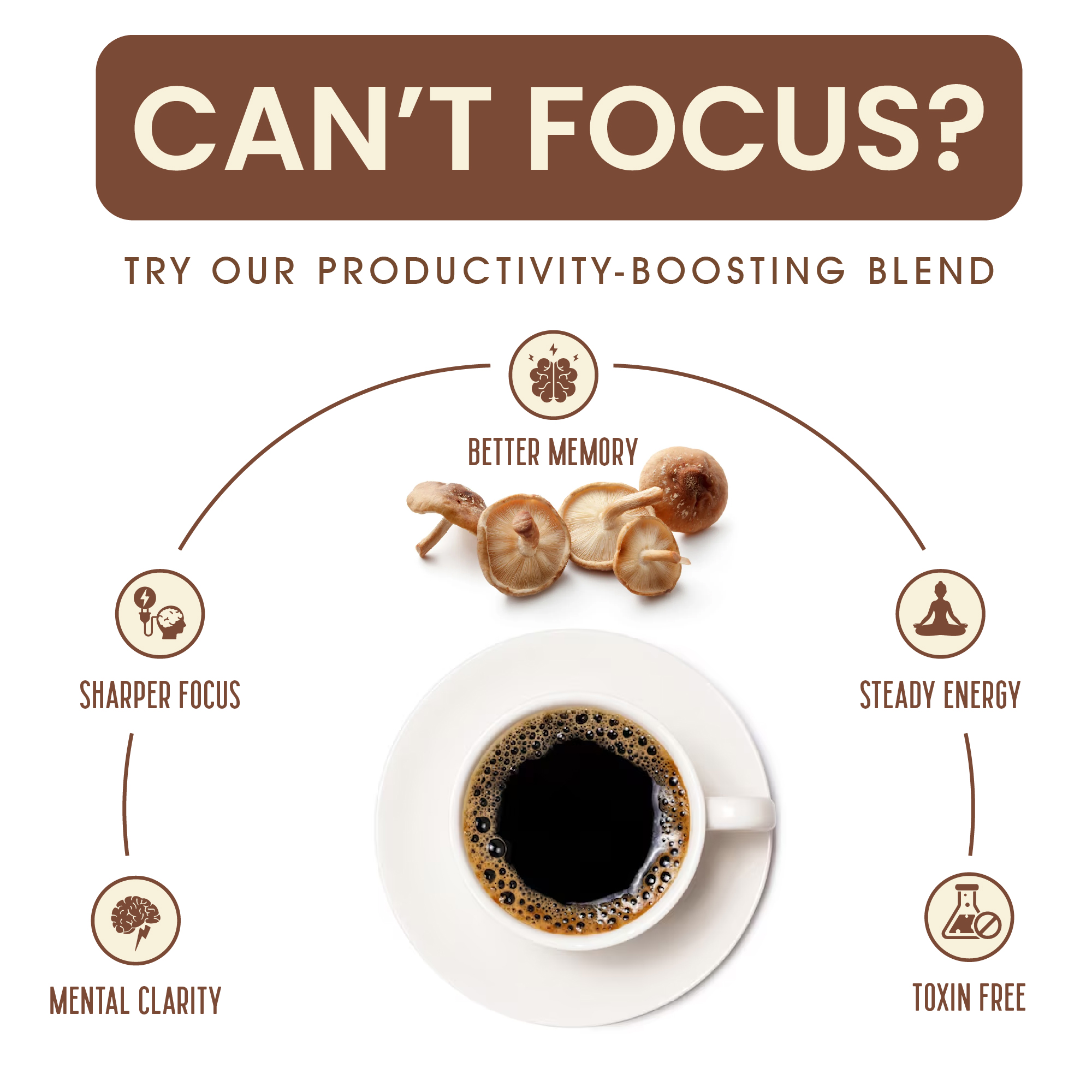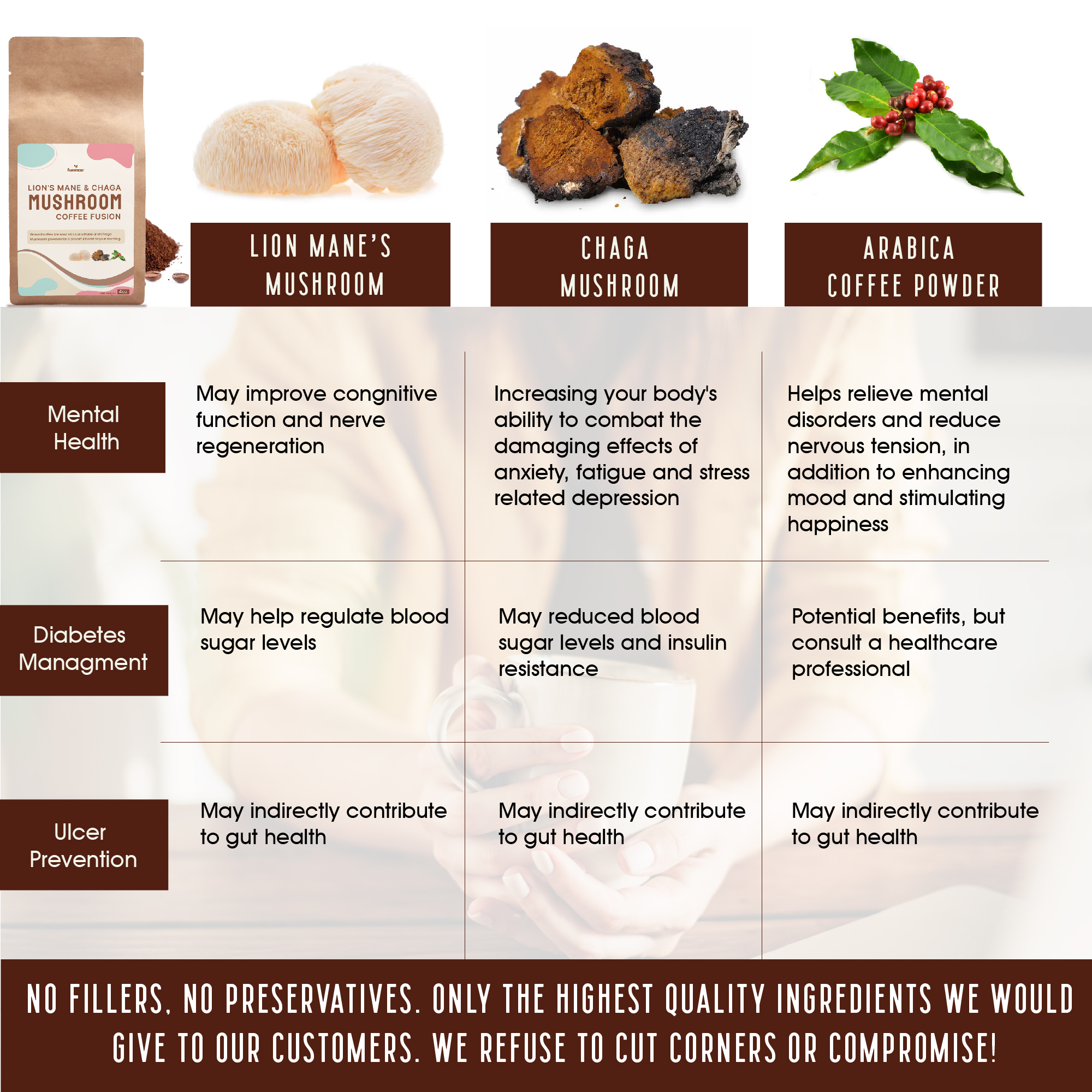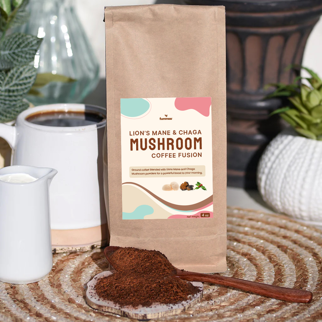 | Ingredients | 90% USDA Organic Arabica Coffee, 5% USDA Organic Lion’s Mane Mushroom Powder, 5% USDA Organic Chaga Mushroom Powder. |
